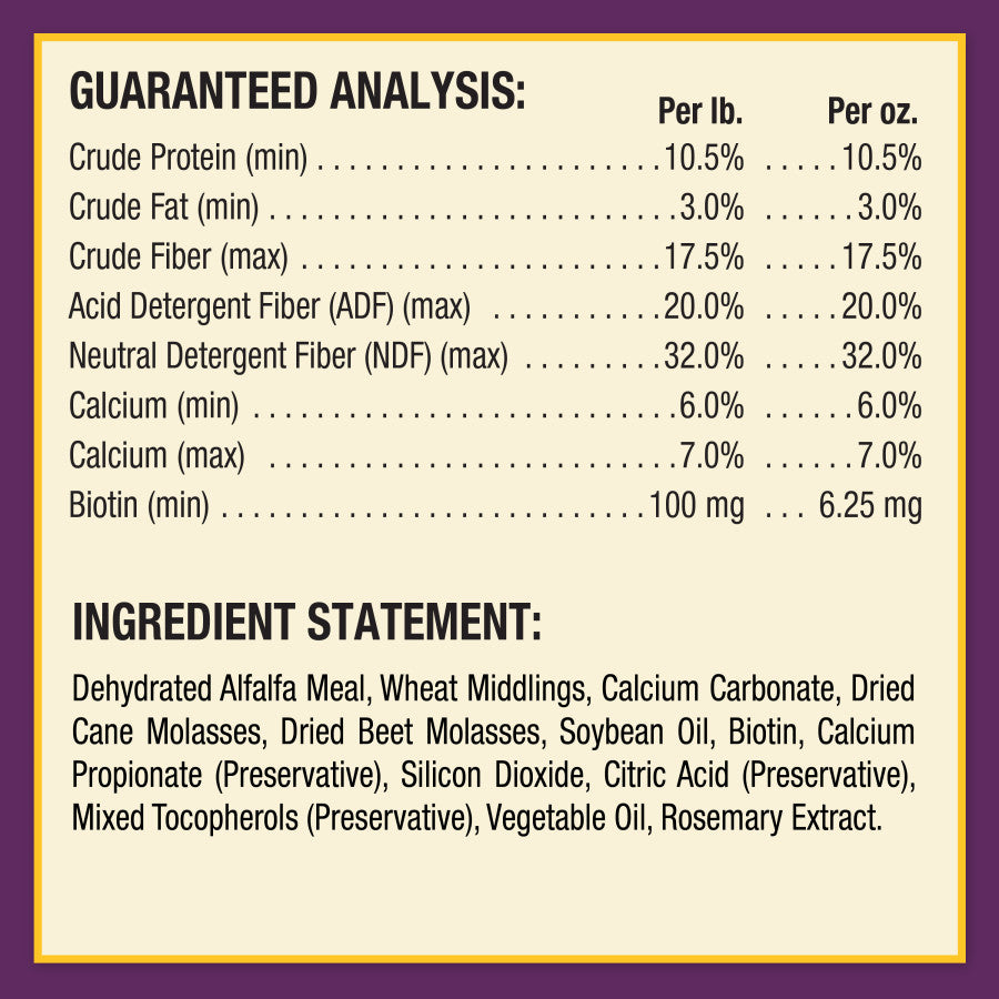 - Feeding Instructions: Feed 1 oz. (1 Scoop) of Vita-Biotin Crumbles supplement daily with regular grain ration
