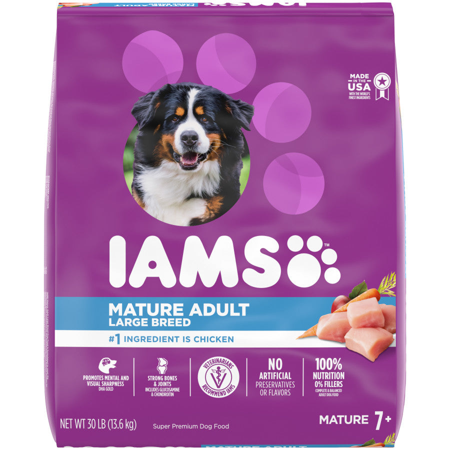- Contains one (1) 30 lb. bag of IAMS Mature Adult Large Breed Dry Dog Food for Senior Dogs with Real Chicken