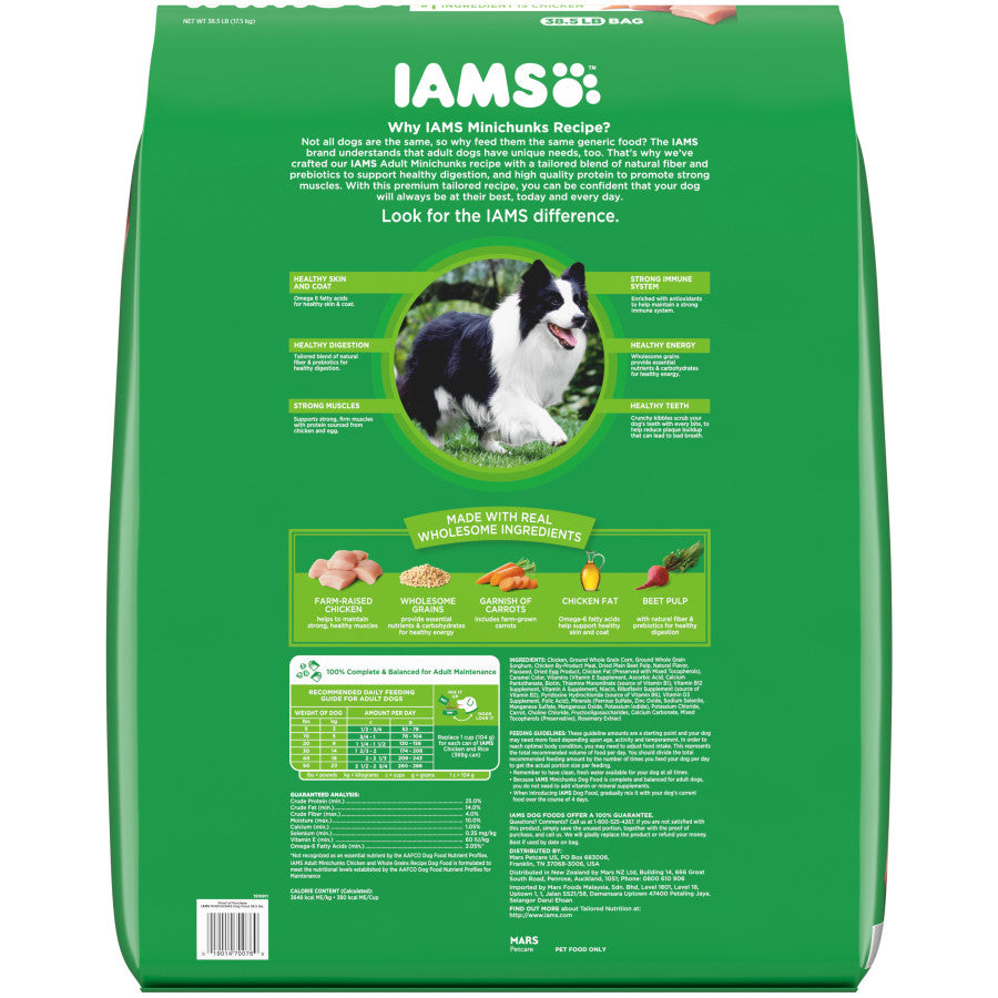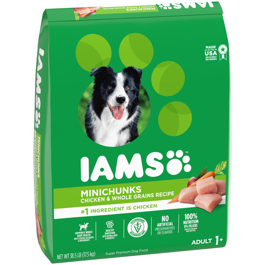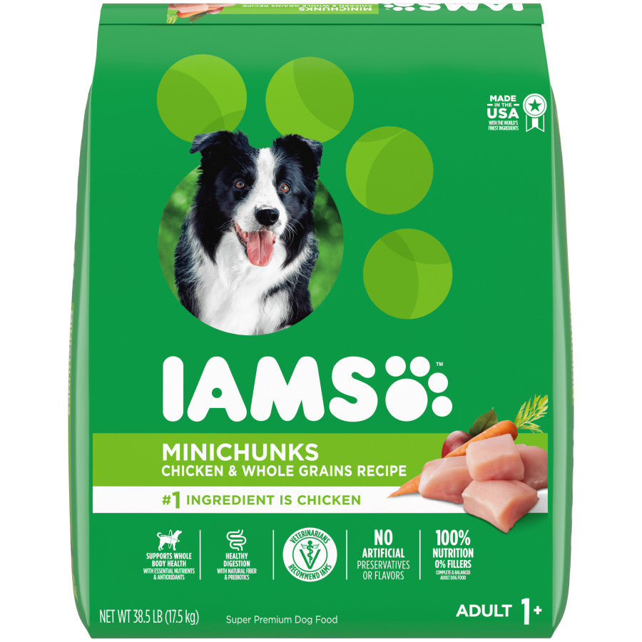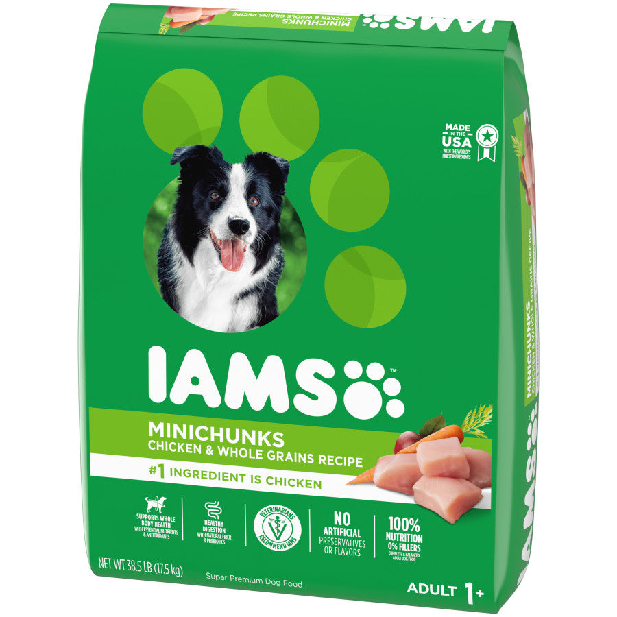 - Contains one (1) 38.5 lb. bag of IAMS Adult Minichunks Small Kibble Dry Dog Food with Real Chicken