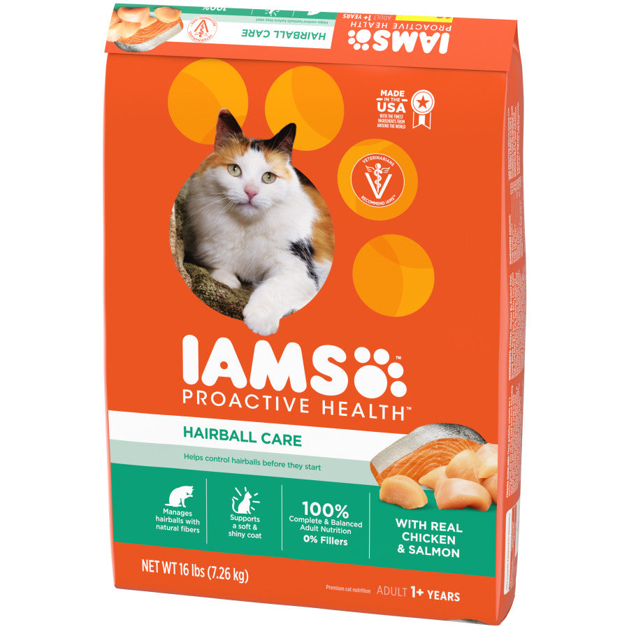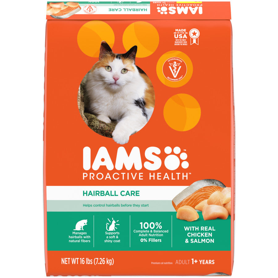 - Contains one (1) 16 lb. bag of IAMS PROACTIVE HEALTH Adult Hairball Care Dry Cat Food Kibble with Chicken and Salmon