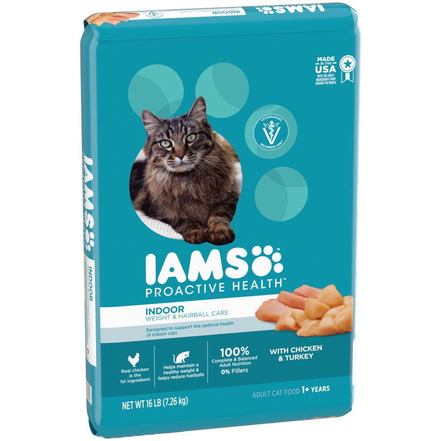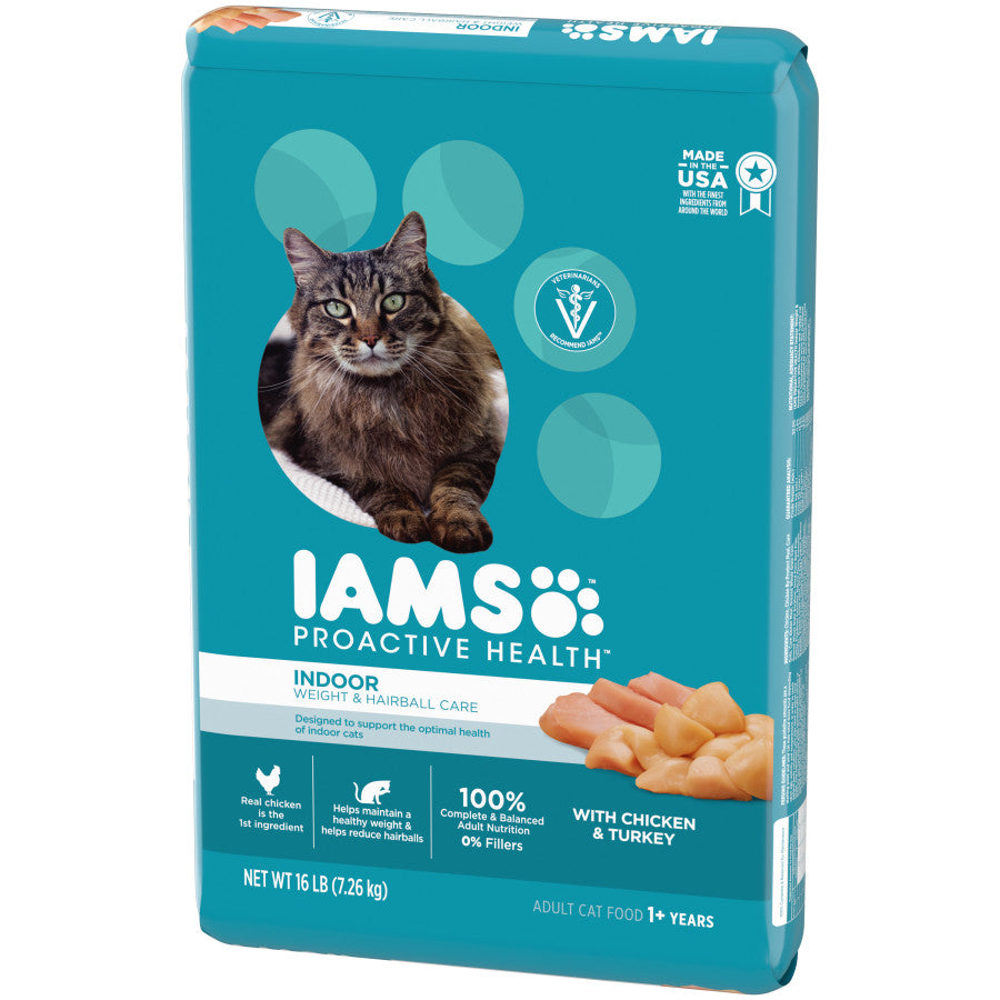 - Contains one (1) 16 lb. bag of IAMS PROACTIVE HEALTH Adult Indoor Weight & Hairball Care Dry Cat Food with Chicken & Turkey