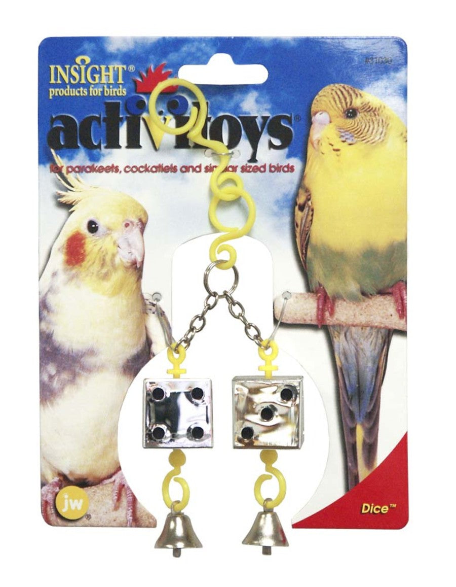 The JW® Pet ActiviToys® Dice Toy are designed to meet your pet bird's natural need for physically and mentally stimulating activities. Your feathered friend will be fascinated with the shiny dice as he shakes and rolls them with his tiny beak. This clever and fun bird toy will engage your pet bird's mind as well as his motor skills, keeping him vigorous and healthy. Features two silver dice with hanging bells for added play fun. Easily connects to your pet bird's cage with a bendable plastic hanger.