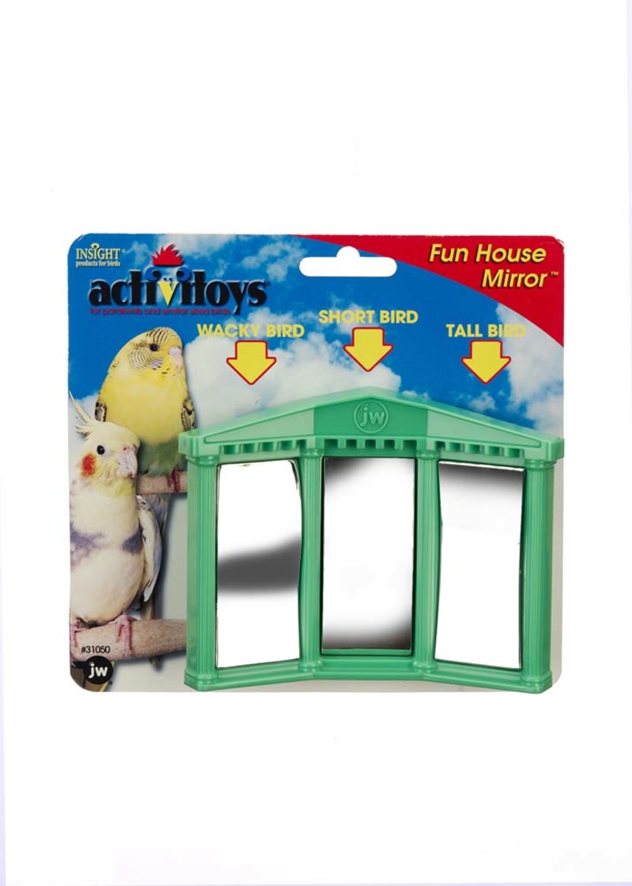 The JW Pet® ActiviAToys® Fun House Mirror bird toy is designed to meet your pet bird's natural need for physically and mentally stimulating activities. This clever bird size funhouse mirror bird toy will keep your feathered friend entertained and active for hours. The three mirrors show different altered reflections of your pet bird in each view, including short bird, tall bird, and wacky bird. Relieves cage boredom and engages motor skills Features easy installation using a bolt-on attachment so you can hang it anywhere in the cage. Great for parakeets, cockatiels, and similarly sized birds.
