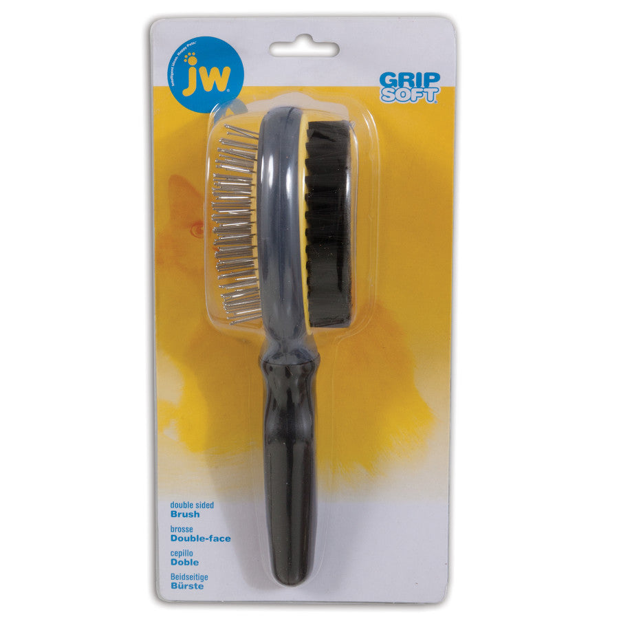The JW® GripSoft® Cat Double Sided Brush is perfect for medium to long haired felines. This dynamic tool has a pin brush on one side to tease out snarls and tangles and on the other side a bristle brush to finish and bring out the shine in the coat. The JW non slip ergonomically designed handle is also more comfortable on the hand making grooming a more pleasurable experience for you.