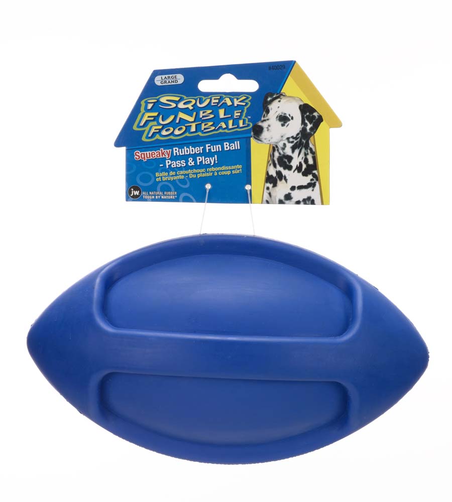 This football is just for dogs. The JW® iSqueak® Funble is smartly designed to be tossed, passed, carried and chewed with ease. You can play with it too, just give your doggie first dibs. Durable for extended play, squeaky and sporty this dog toy is great for fetch and dog/pet parent bonding. Promotes exercise and helps eliminate boredom. Durable rubber is easy on teeth and gums, but stands up to a chomping. Ships in assorted colors.
