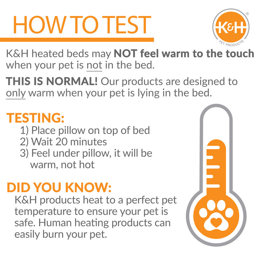 - Use Instructions: You'll notice that the K&H Heated Bed may not feel warm to the touch when your pet is not on the pad. THIS IS NORMAL! Our products are designed to only warm when your pet is lying in the bed. You can test the pad by placing a large pillow on top of the bed. After about 20 minutes, feel under the pillow. It will feel warm, not hot. If you feel warmth, the product is working as designed. For use with 110/120 volt electrical current only.