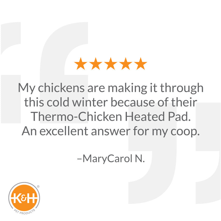 The Thermo-Chicken Heated Pad is perfect for chicks and chickens. The 12.5 X 18.5 size is perfect for most chicks and chickens. Use in the first stages of life for mandatory heat requirements and later when old man winter pays a visit! The internal thermostat is pre-set to the perfect temperature. Ensuring your chicks do not get chilled will help prevent pasting and support a healthy start. Only 40 watts makes the Thermo-Chicken Heated Pad very energy efficient. It can be placed on the floor or mounted to a wall. Constructed of ABS plastic for durability. For use in an enclosure. This chicken heater has been tested & certified by MET Labs to exceed USA/CA electrical safety standards. One year limited warranty.