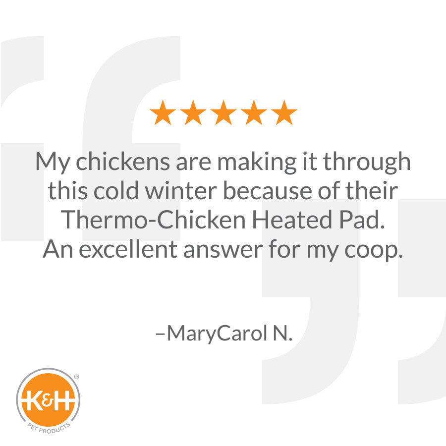 The Thermo-Peep Heated Pad is the ideal additional heat source for your peeps! The 9 x 12 size is perfect for the urban farmer in many settings. Use in the first stages of life for mandatory heat requirements and later when old man winter pays a visit! The internal thermostat is pre-set to the perfect temperature. Ensuring your chicks do not get chilled will help prevent pasting and support a healthy start. Only 25 watts makes the Thermo-Peep Heated Pad the most energy efficient heat source on the market for your peeps. We even capped the cord entrance and the first 18 of the power cord with steel for the ultimate safety and well-being of your birds. Holes in the four corners allow for screws to anchor the pad on wood surfaces or wired in place with traditional chicken coops. For use in an enclosure. MET Listed. One year limited warranty.