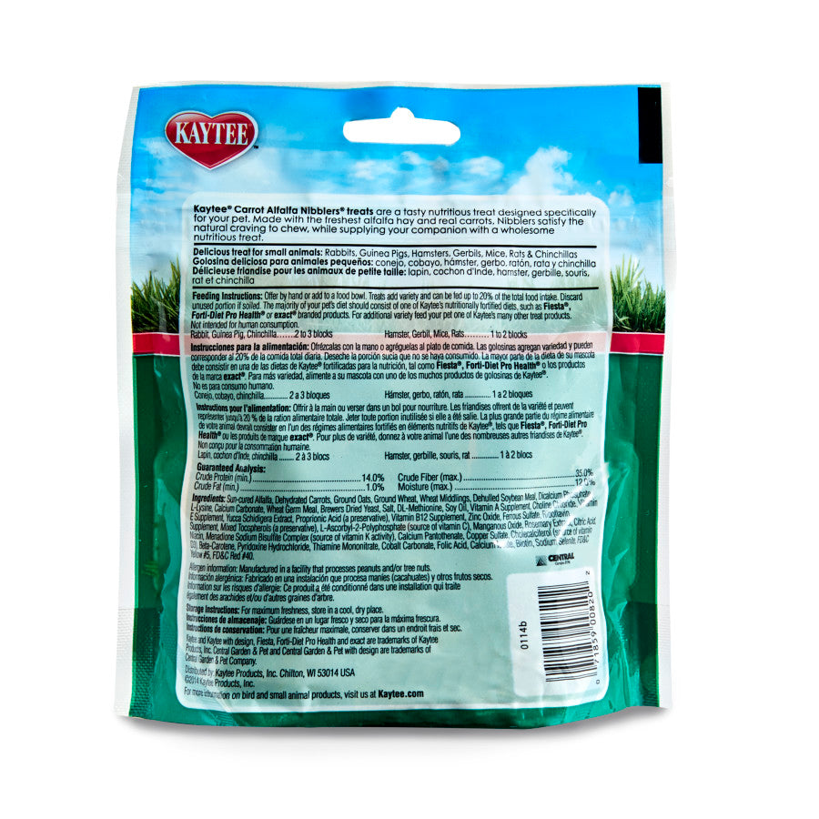 Kaytee Carrot Nibblers are a nutritious treat designed specifically for your pet. Made with the freshest alfalfa hay and real carrots, Nibblers satisfy the natural craving to chew, while supplying your companion with a wholesome nutritious treat