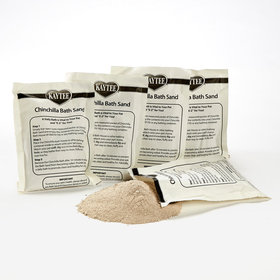Chinchilla Bath Sand is a revolutionary idea in the care of chinchillas! Chinchilla Bath Sand is a superior alternative to the traditional chinchilla dust because its virtually dust free especially when used with your Kaytee Chinchilla Bath House. Bath sand is made from a 100-percent natural volcanic mountain pumice found in the Andes mountains, which is where your chinchilla's wild relatives are from. Each box of Chinchilla Bath Sand includes 5 ready-to-use easy to pour packets ensuring you use a perfect amount of sand every time.