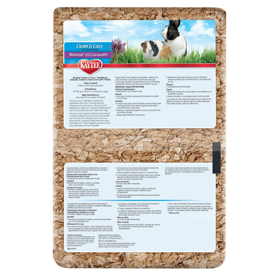 Create an all-natural, snuggly sanctuary for your small pet with Kaytee® Clean & Cozy™ Natural Lavender Bedding. The scent of real lavender buds helps cover odors with every step your pet takes. Because the ingredients are natural — from the scents to the bedding — you'll feel good knowing you're making an environmentally conscious choice. And you'll be comfortable letting your pet nest, burrow and play in the soft and cozy paper. The bedding's all-natural lavender buds are safe for your pet and soothing for you. And this is just the beginning of what makes this brand stand out. Kaytee® Clean & Cozy™ Natural Lavender Bedding uses zero artificial scents and is made from safe, all-natural, premium paper. Every ingredient is exactly what an Earth-loving pet parent would want. In contrast, other products use an inferior paper by-product known as sludge. Because we use paper and scents that don't contain harmful chemicals or by-products, you can rest easy knowing your pet will be both cozy and safe. It's paper you would feel comfortable using, so you'll feel comfortable letting your pet nest and burrow in it too. Using high-quality paper means our Natural Lavender bedding is highly absorbent — it absorbs five times its weight in liquid and expands to three times its size. Plus, it's easy to scoop and discard. Absorbent bedding gives you peace of mind knowing your pet won't develop respiratory issues from a smelly habitat. Instead, your pet will sleep soundly in comfy bedding that's 99.9% dust free. And our premium, super-absorbent bedding comes with a money-back, odor-control guarantee.