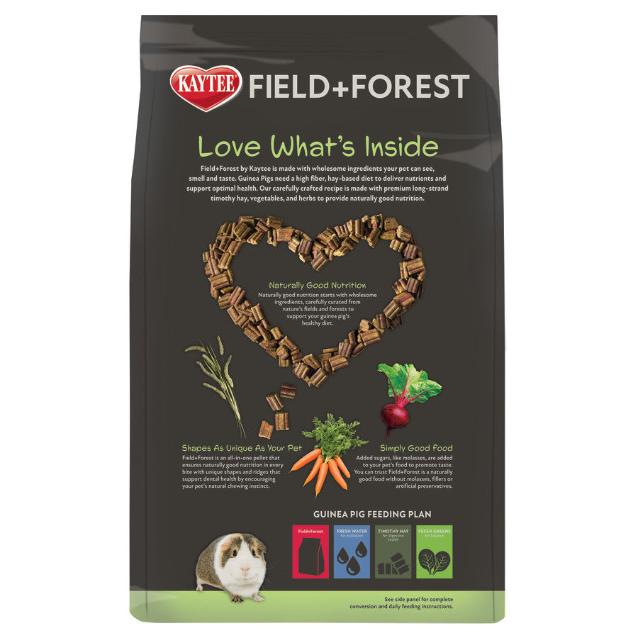 Kaytee® Field+Forest is a premium guinea pig food made with wholesome ingredients your pet can smell and taste. Each ingredient is carefully curated from nature’s fields and forests to support your guinea pig’s healthy diet. The all-in-one pellet works to ensure naturally good nutrition in every bite with unique shapes and ridges that support dental health by encouraging your pet’s natural chewing instinct. Kaytee® Field+Forest is simply good food. It contains NO added molasses, NO fillers, and NO artificial preservatives.