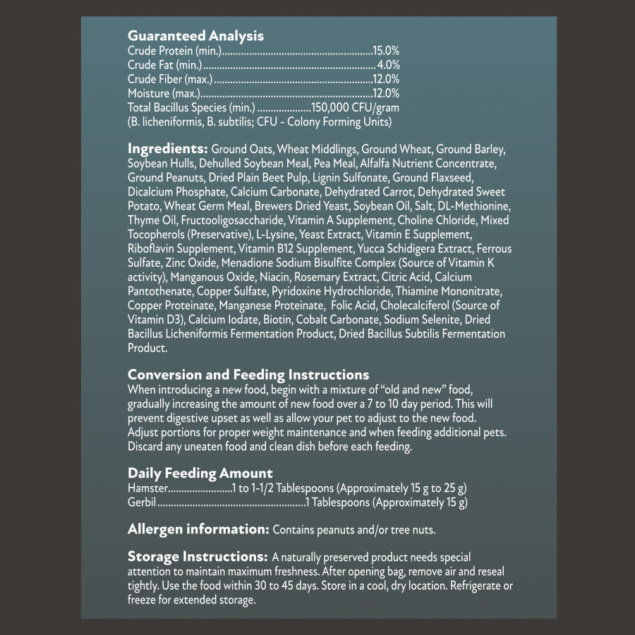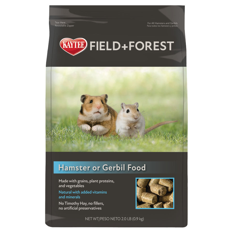 Kaytee® Field+Forest is a premium hamster and gerbil food made with wholesome ingredients your pet can smell and taste. Each ingredient is carefully curated from nature’s fields and forests to support your hamster or gerbil’s healthy diet. The all-in-one pellet works to prevent selective feeding and ensure naturally good nutrition in every bite. Unlike other small animals, timothy hay is not nutritionally necessary for hamsters and gerbils which is why it is not included in this recipe. Kaytee® Field+Forest is simply good food. It contains NO added molasses, NO fillers, and NO artificial preservatives.