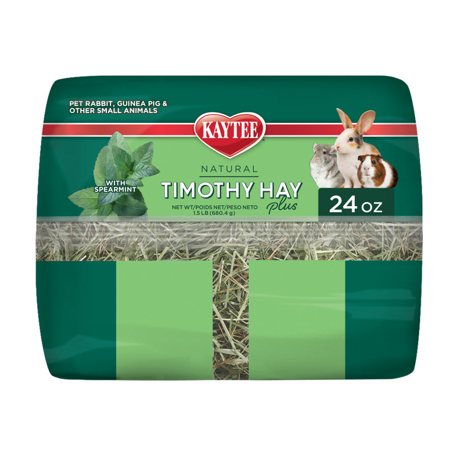 Kaytee Timothy Hay Plus with Spearmint combines the benefits of Timothy hay with the flavor and texture variety that complement any Kaytee fortified food. Kaytee feeds more hay to small pets than anyone else. We pride ourselves on providing fresh, tasty, all-natural hay. Grown specifically for small animals, timothy hay is hand selected to ensure long fiber strands and a proper leaf to stem ratio to support your small pet’s digestive health. At Kaytee, we understand that taste matters. Our hay tastes better because it is naturally grown and harvested with care. It is grown in fertile farmland graced with abundant sunlight and nourished by cool, rocky mountain water. Naturally grown without pesticides or artificial ingredients, our farmers only grow supreme grade hay. This means, high quality and superior nutrition for your small pet. At Kaytee, we are committed to harvesting the best nature has to offer.