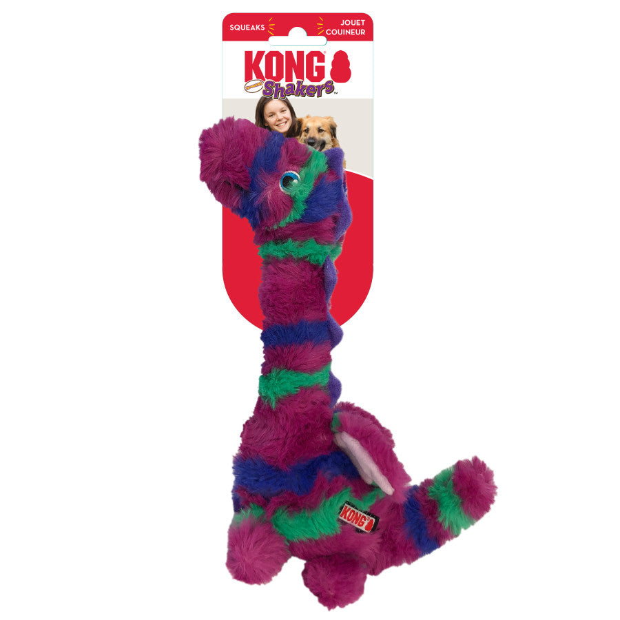 KONG Shakers Honkers Dragon’s magic lies in his internal neck tube that delights dogs’ natural instincts with an irresistible crunch that kicks up the fetching fun. His long, floppy body fuels shaking action and is great for tugging while the low tone squawk sparks interest and keeps dogs playing longer with a plush-covered pal great for cuddling in the liar after the action.