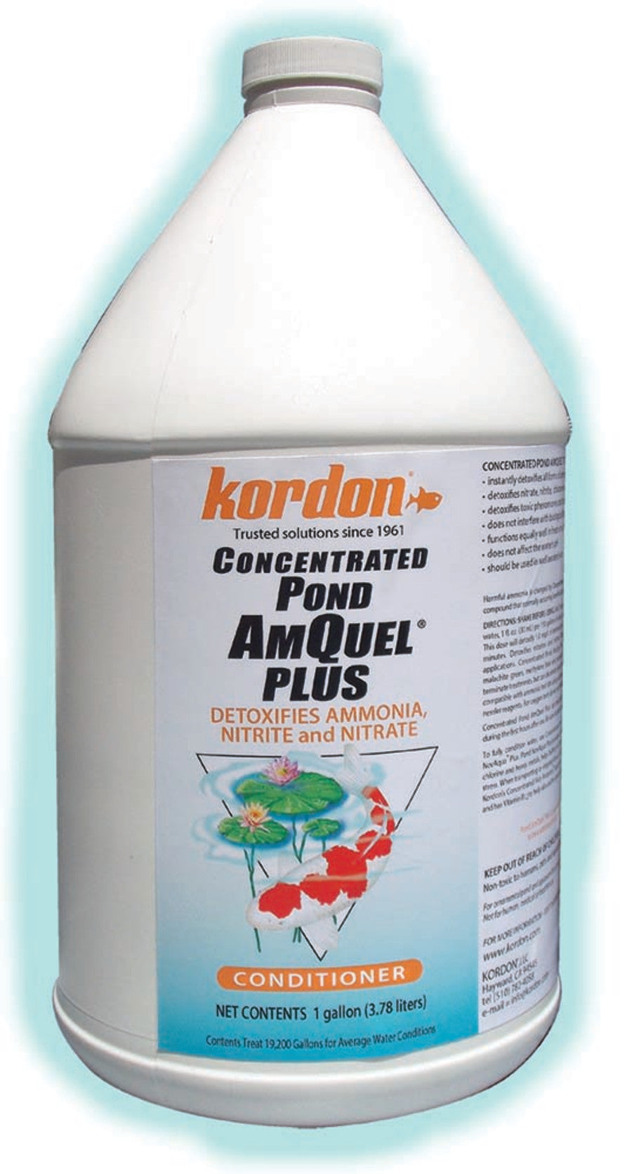 Kordon Pond AmQuel Plus Concentrate removes chlorine, chloramines, ammonia, nitrates, and nitrites from pond water safely, easily and quickly. This concentrated formula treats larger volumes of water in a single step.