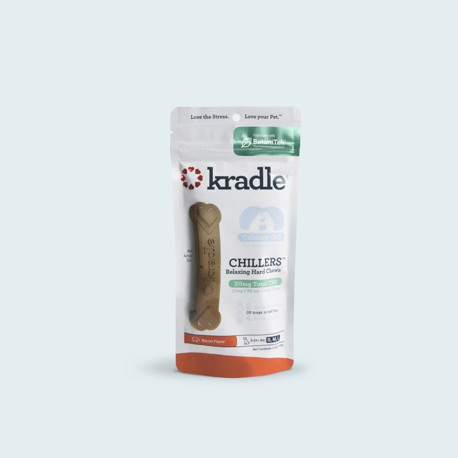 Kradle® Chillers keep dogs occupied for an extended period of time, all while calming them. Dogs will always be excited for the tasty bacon flavor and relaxing experience that keeps going, and going, and going! Our Chillers contain broad-spectrum CBD derived from the highest quality American-grown hemp, combined with our proprietary BotaniTek™ blend of proven natural calming ingredients. Chillers are extensively 3rd party tested and verified for purity and potency. These delicious long-lasting hard Chews serve as the perfect distraction for your dog during prolonged stressful situations, such as when you leave the house or go on road-trips. Kradle has crafted a full assortment of products to help reduce stress and anxious behavior. Our patent-pending BotaniTek™ formulations combine pure hemp-derived compounds and other premium, natural ingredients to calm your dog from the inside out.
