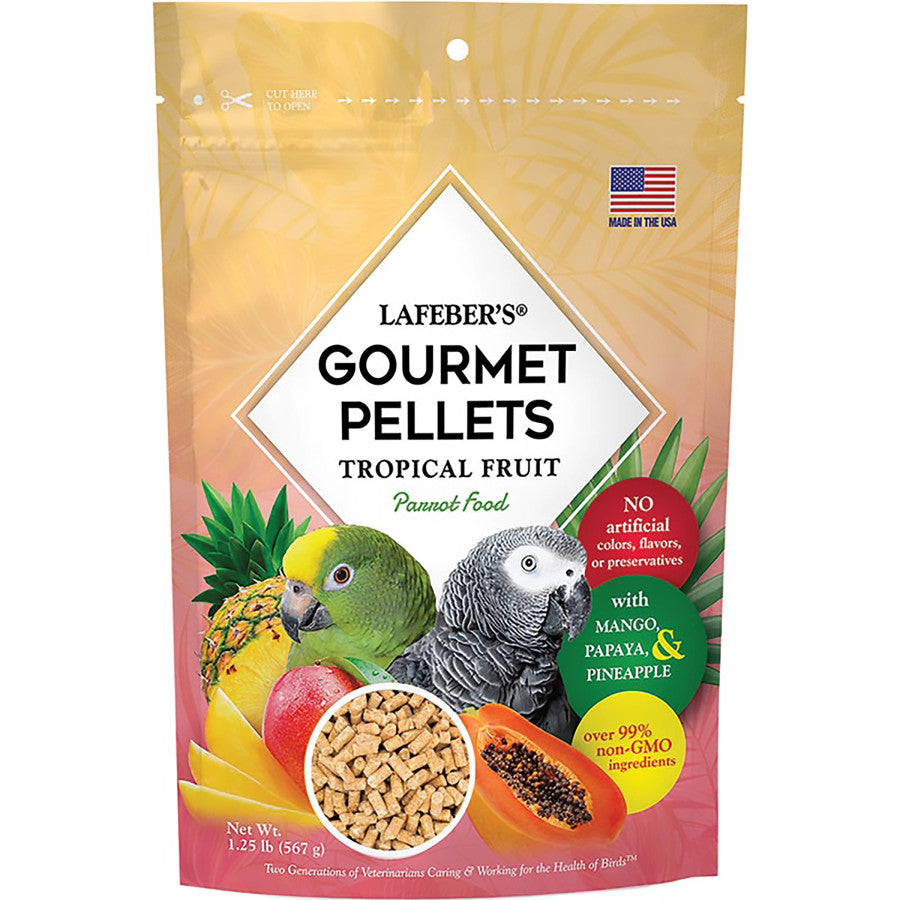 - Feeding Instructions: Offer a fresh serving of Tropical Fruit Gourmet Pellets to your parrot daily, placing in a clean food dish. Please see the average serving portions below, but adjust the serving so pellets are available all day. Include fresh fruits and vegetables (about 20% of their total diet), and always provide plenty of clean, fresh water. For more foraging fun, “hide” some pellets in other places where your parrot enjoys hanging out. Be sure your bird finds these within the day