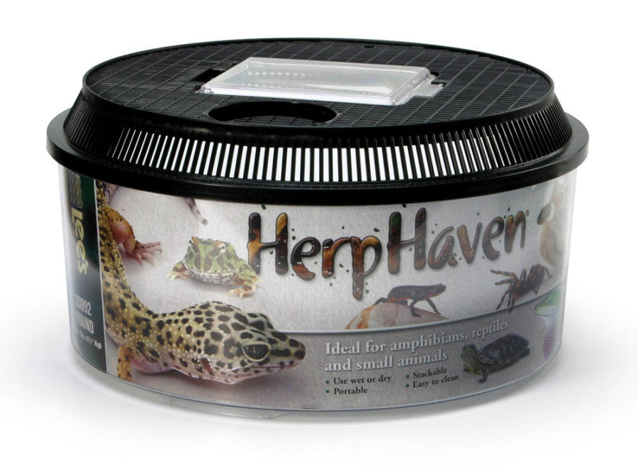 Herp Havens are the ideal carrier for various species of reptiles & amphibians. They can also be used as a terrarium or nursery and the Herp Haven lids have hinged viewer/feeder, attachment holes and airline tubing holes. Size: 10 3/8in Diameter x 5 1/2in High.