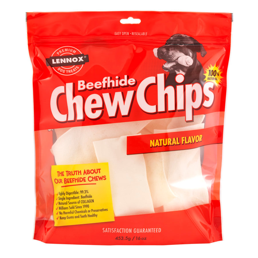 Lennox's Beefhide Chew Chips are loved by all dogs regardless of size and breed . 99.3% digestible (tested), containing 77.3% of collagen (tested). Made in South America using selected raw materials, without any chemicals that can make the dog sick.Long lasting chew that will help keep teeth and gum healthy.