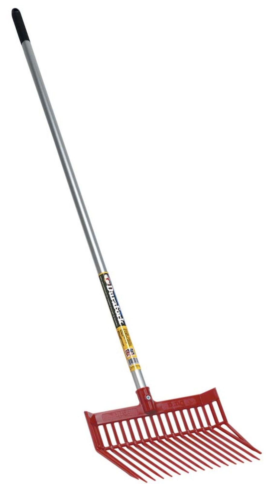 The lightweight, 52 inch anodized aluminum handle makes this bedding fork extra-easy to handle. Fork head is manufactured from extra-strong 100 percent polycarbonate to provide super strength and flexibility. Designed for long-lasting use around the farm, ranch, and home. Specially designed tines are uniquely angled to provide easy manure pickup with less spilling. Nylon locknut secures the handle. The red fork head is 13.125 inch long by 15.125 inch wide.