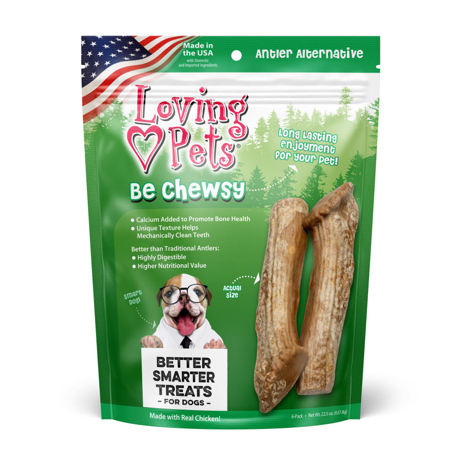 Loving Pets Be Chewsy Antler Alternatives are more digestible, more affordable, and safer for your pet's intestinal tract than traditional antlers. These unique chews have real chicken and added calcium to promote healthy bones. Plus, they're lovingly made in the USA.