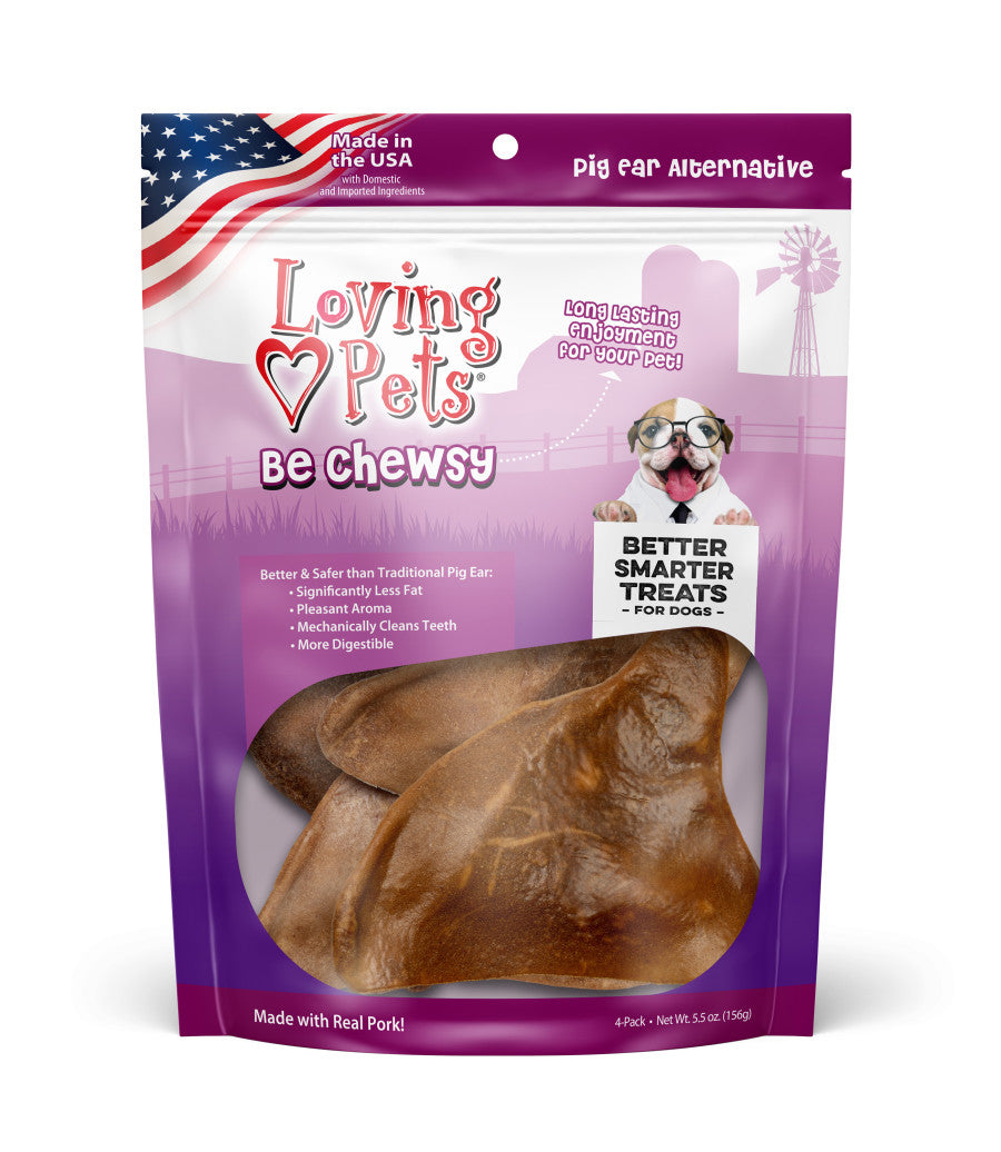 Loving Pets Be Chewsy Pig Ear Alternatives are more digestible, more affordable, and safer for your pet's intestinal tract than traditional Pig Ears. Lower in fat, long lasting, and with teeth cleaning benefits, these chews also include real pork your dog craves! Plus, they're lovingly made in the USA.