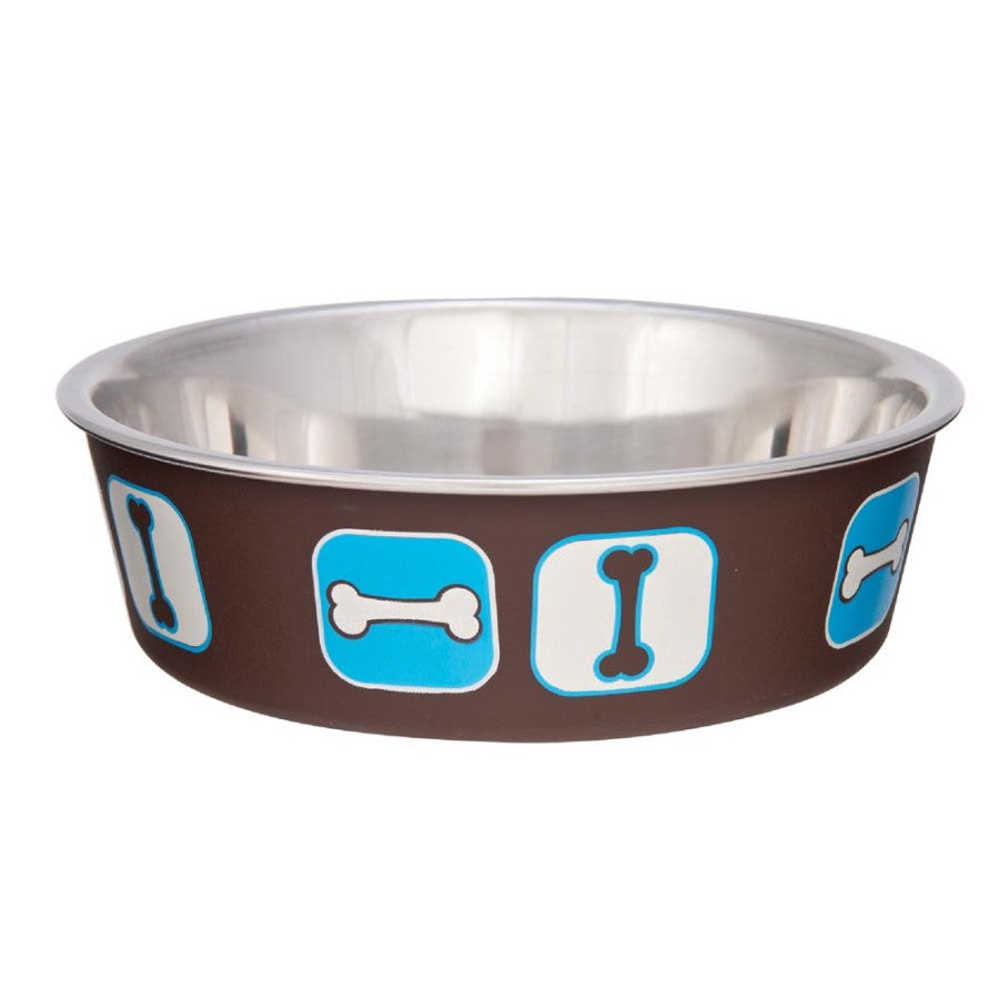 The award winning, patented and BEST SELLING PET Dish LINE in the pet industry just got even better with these new patterns and colors. Bella Dishs are the PERFECT PET DISH featuring vet-recommended stainless steel interiors with an attractive poly-resin exterior. The removable rubber base prevents skids and spills, eliminates noise. Dishwasher safe, just remove the no skid rubber base. 6 new Coastal colors and 2 Cosmopolitan colors. All available in 4 sizes. Alternating bone patterns of cream colored bones with chocolate brown outlines set in a pink field and chocolate bones with pink outlines set in a cream colored field, all on a chocolate brown background.