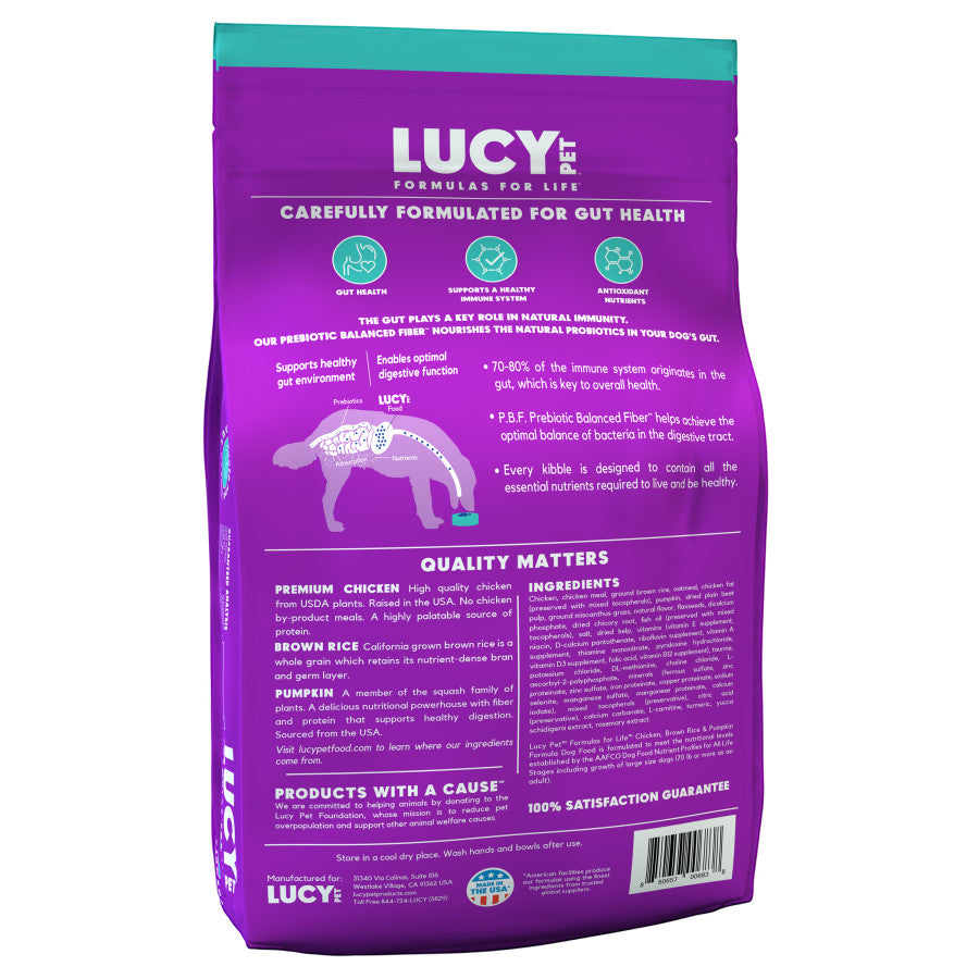 Lucy Pet Formulas for Life Chicken, Brown Rice & Pumpkin Limited Ingredient Diet formula features our advanced P.B.F. Prebiotic Balanced Fiber (TM) to produce an optimal environment in the digestive tract and help the body absorb nutrients more efficiently. The number one, single-sourced ingredient is chicken from the USA, with absolutely no chicken meat by-products. Made in the USA