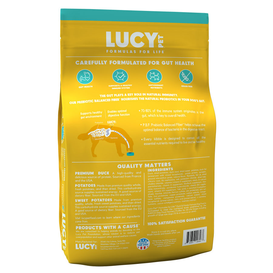 Lucy Pet's Limited Ingredient Duck and Potato Grain-Free Formula features our advanced P.B.F. Prebiotic Balanced Fiber to produce an optimal environment in the digestive tract and help the body absorb nutrients more efficiently. The number one, single-sourced meat ingredient is duck meat from France and USA, with absolutely no duck by-products. No ingredients from China.