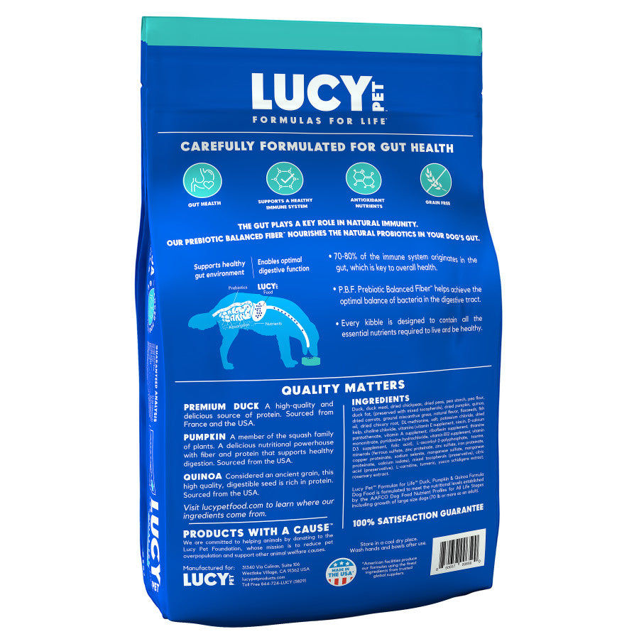 Lucy Pet's Duck, Pumpkin, and Quinoa Grain-Free Formula features our advanced P.B.F. Prebiotic Balanced Fiber to produce an optimal environment in the digestive tract and help the body absorb nutrients more efficiently. The number one ingredient is duck meat from France and USA, with absolutely no duck by-products. Includes chickpeas (rich in protein and complex carbohydrates, including starches and fibers), delicious pumpkin (a nutritional powerhouse with fiber and protein that helps aid in healthy digestion), and quinoa (a high quality, digestible seed rich in protein, containing essential amino acids). This formula includes a superfood blend of ingredients naturally preserved. No ingredients from China.