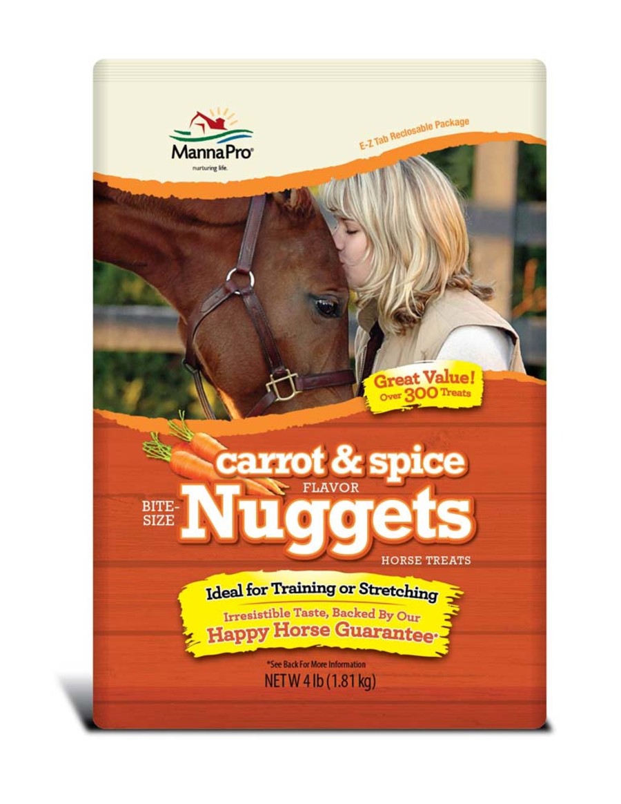 MANNA PRO BITE-SIZED AND NUTRITIOUS CARROT & SPICE NUGGET TREATS FOR HORSES IN A CONVENIENT RE-SEALABLE 1# BAG.