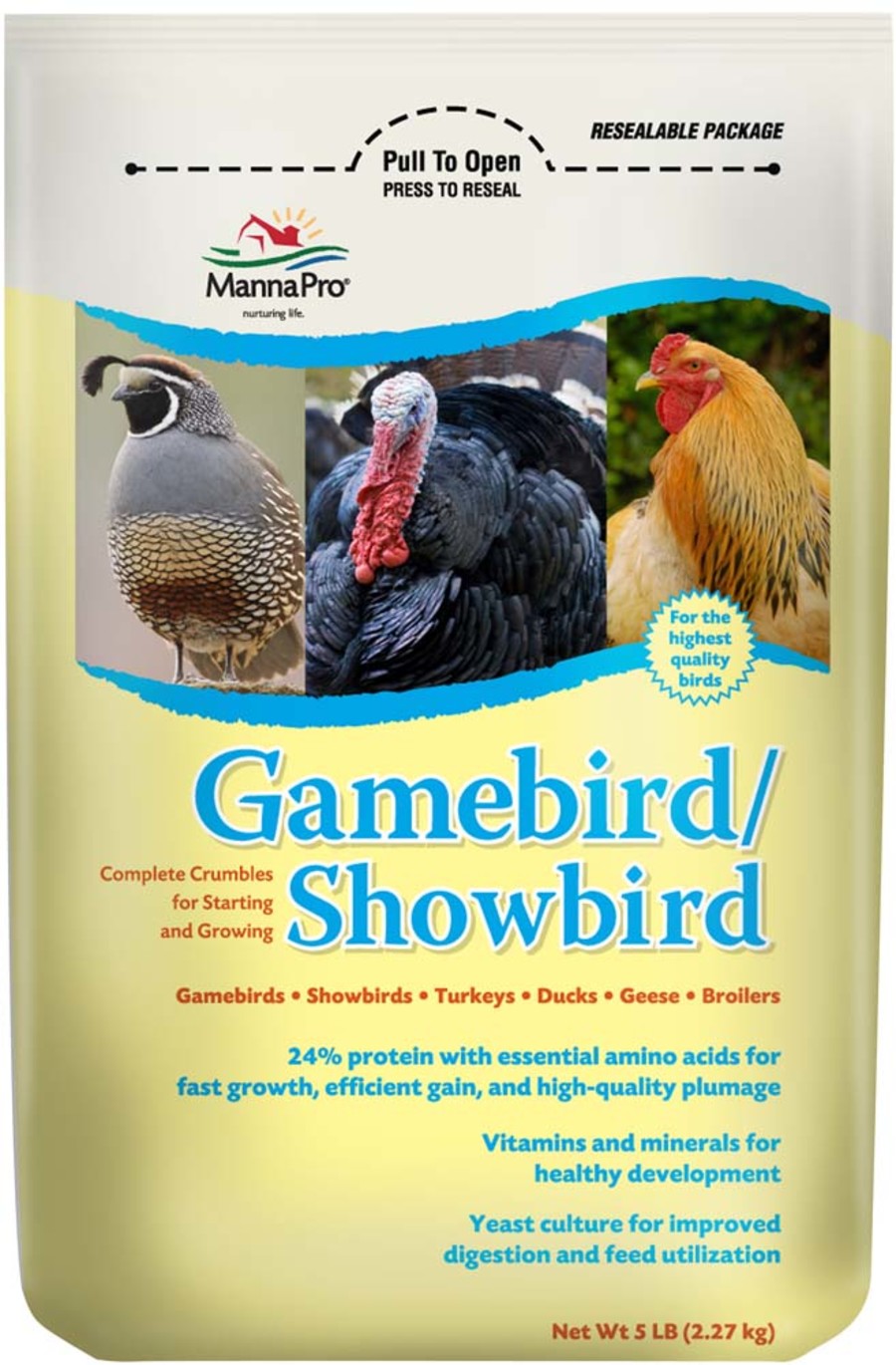 - Recommended For: Manna Pro Gamebird/Showbird Feed is designed for starting and growing gamebirds, turkeys, ducks, geese and broilers