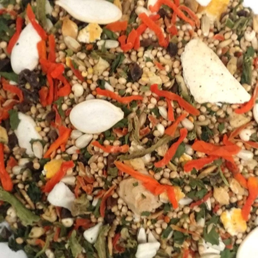 - Ingredients: White Proso Millet; Canary Seed; Safflower Seed; Red Proso Millet; Oat Groats; Rolled Corn; Buckwheat; Rolled Varley; Diced Carrots; Apple; Broken Cuttlebone; Oyster Shell; Small Broken Cinnamon; Spinach; Vitamin Powder; Safflower Oil; Anise Seed