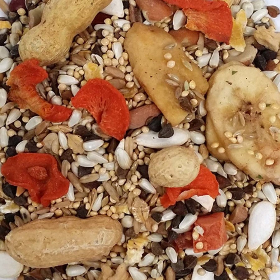 - Ingredients: Safflower Seed; White Proso; Canary Seed; Buckwheat; Pumpkin; Whole Wheat; Oat Groats; Rolled Corn; Rolled Barley; Shelled Peanuts; Dog Food; Small Broken Cinnamon; Broken Cuttlebone; Vitamin Powder; Safflower Oil