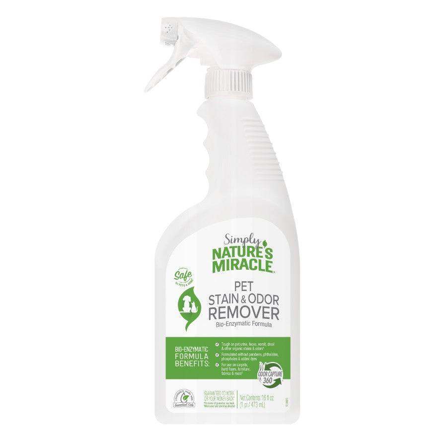 Nature's Miracle Simply Pet stain and odor remover is tough on pet urine, feces, vomit, drool, and other organic stands and odors. Formulated without parabens, phthalates, phosphates, synthetic dyes, synthetic fragrances, and ammonia. Bio-enzymatic, plant-based formula. Safe for pets and home.