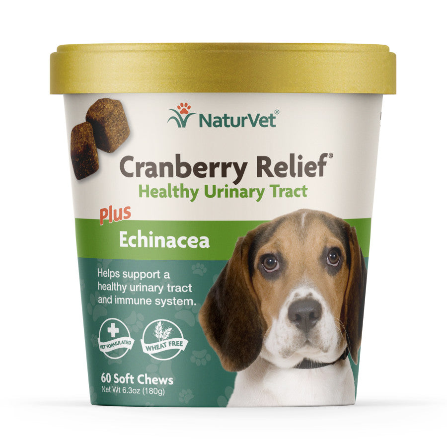 NaturVet Cranberry Relief Plus Echinacea Soft Chews are recommended for dogs to help support a healthy urinary tract and immune system.