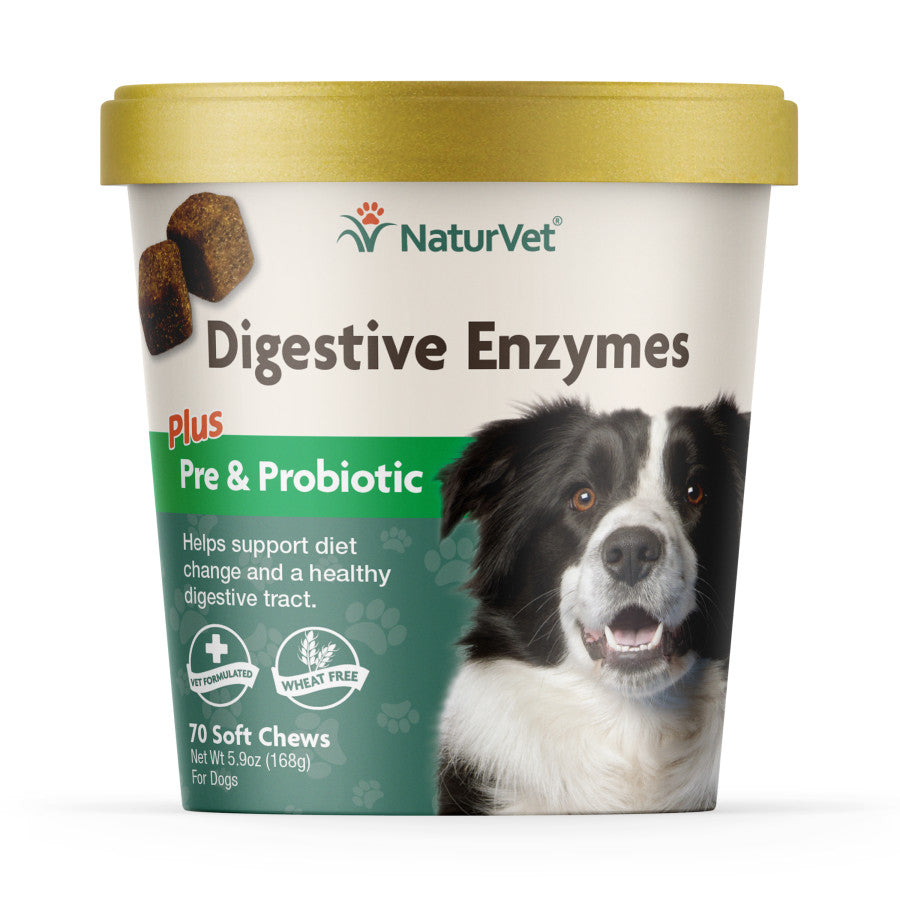 NaturVet Digestive Enzymes Plus Probiotic Soft Chews are recommended for dogs to help support diet change and a healthy digestive tract.