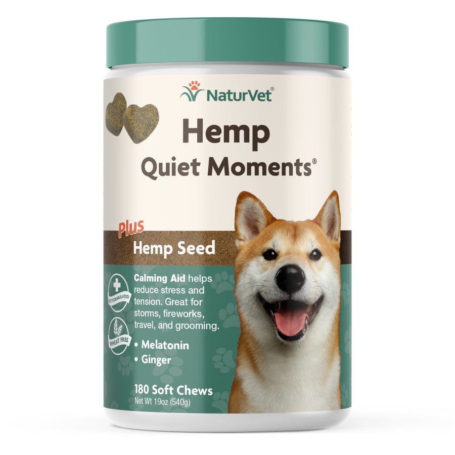 NaturVet Hemp Quiet Moment Dog Soft Chews are veterinarian formulated and recommended for use in dogs over the age of 12 weeks. Our Calming Aid has Chamomile, Thiamine, L-Tryptophan, Melatonin, and Hemp Seed. To complete this synergistic blend is Ginger to help support sensitive stomachs which is especially helpful while traveling. Recommended to use during short term stressful situations like grooming, fireworks, thunderstorms, or travel.
