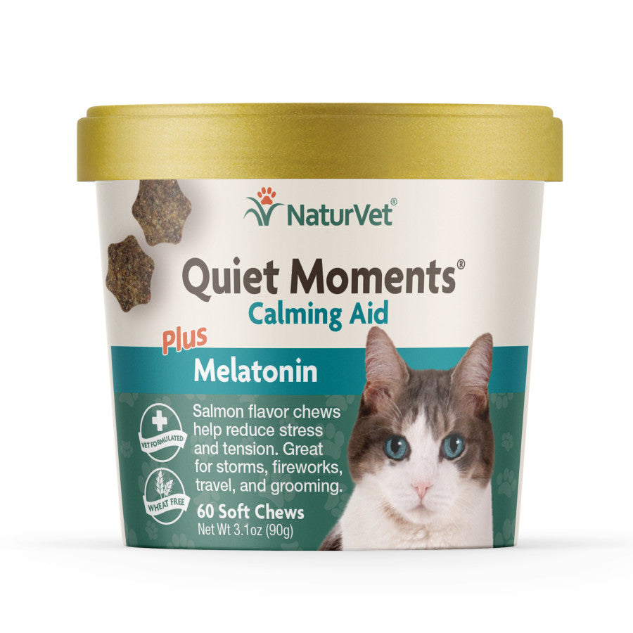 NaturVet Quiet Moments Calming Aid Plus Melatonin Cat Soft Chews contains a unique blend of natural active ingredients to help reduce stress and tension during travel, thunderstorms, fireworks, grooming and separation anxiety.
