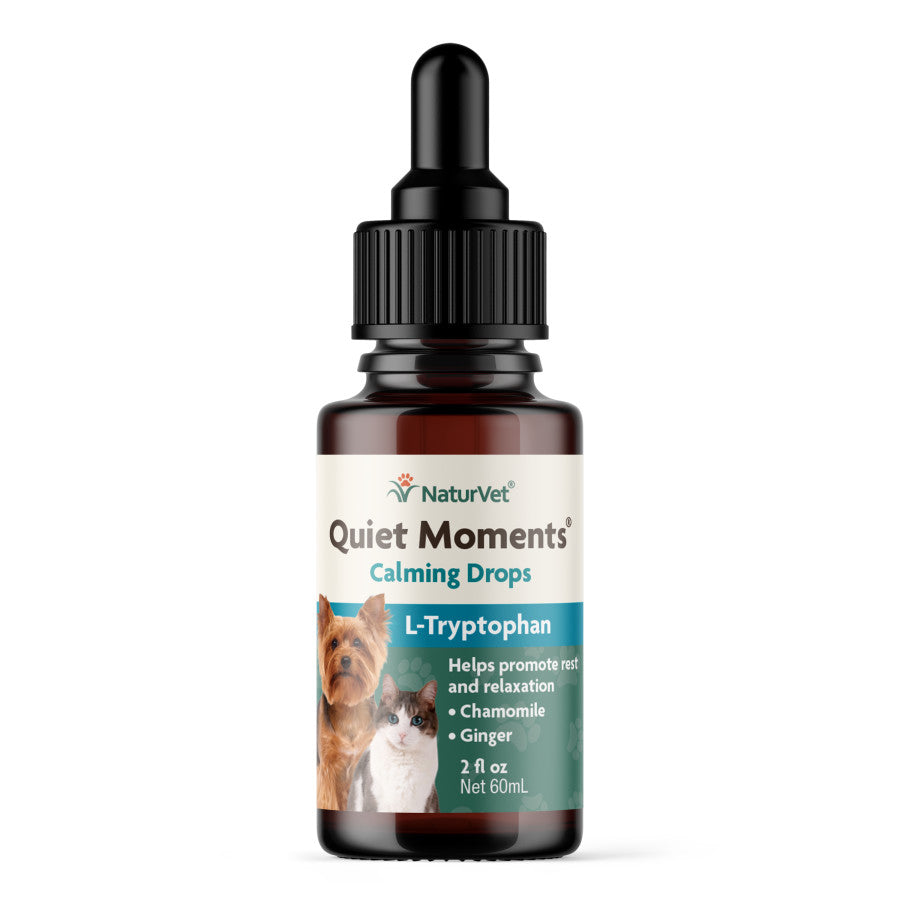 NaturVet Quiet Moments Calming Drops calming aid for dogs and cats is veterinarian formulated with a unique blend of Thiamine, L-Tryptophan, Chamomile, Ginger, Valerian, and Lavender to help reduce stress and tension. Great for storms, fireworks, travel, and grooming.