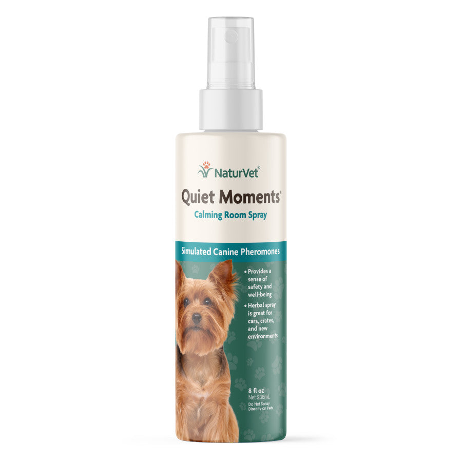 NaturVet Quiet Moments Calming Room Spray with Simulated Canine Pheromones helps provides dogs with a sense of safety and well being. Herbal spray is great for cars, crates, dog houses, pet beds and new environments.