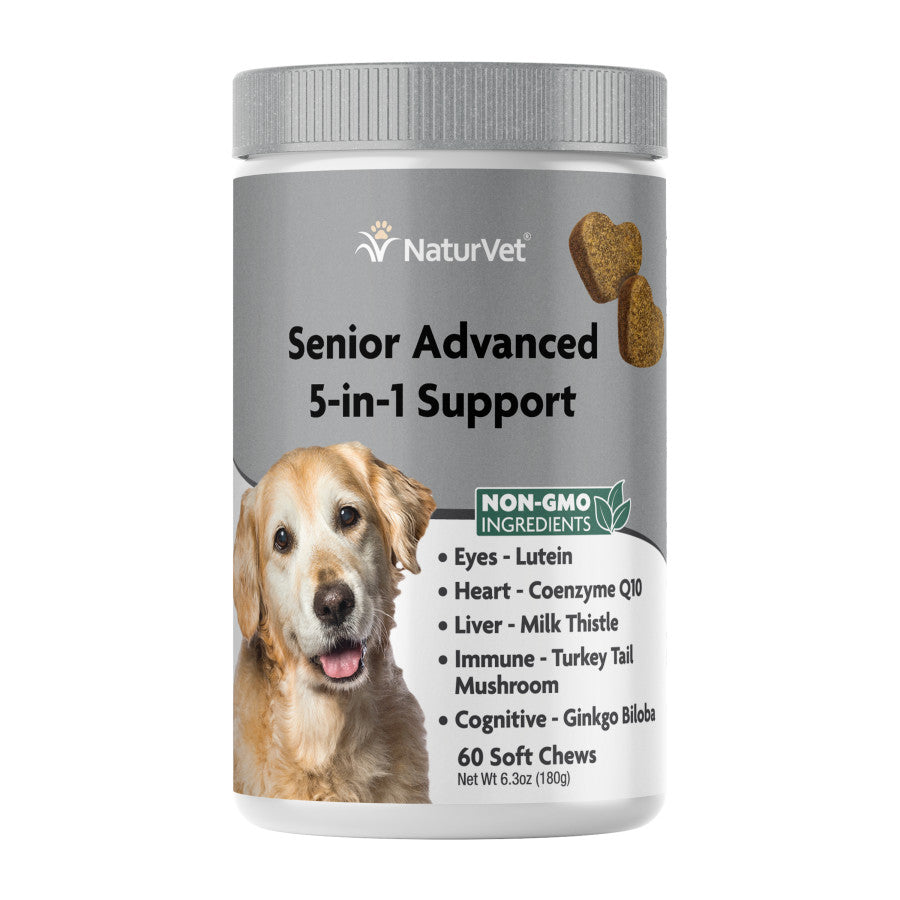 NaturVet Senior Advanced 5 in 1 Support is specially formulated for senior dogs but may be used in dogs over 1 year of age, or when the most support is needed. Contains a unique blend of Turkey Tail Mushroom, Milk Thistle, Ginkgo Biloba, Coenzyme Q10, and Lutein that work synergistically to help support healthy cognitive function, eye, liver, heart, and overall immune health. Veterinarian formulated and recommended.