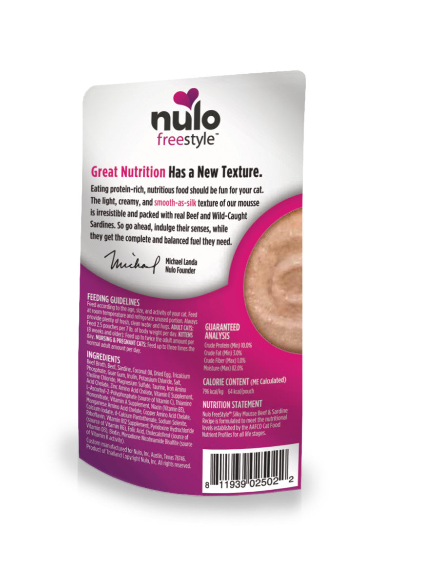 Great Nutrition Has a New Texture Eating protein-rich, nutritious food should be fun for your cat. The light, creamy, and smooth-as-silk texture of our mousse is irresistible and packed with real beef and wild-caught sardines. So go ahead, indulge their senses, while they get the complete and balanced fuel they need. AVAILABLE IN 2.8 OZ POUCHES.