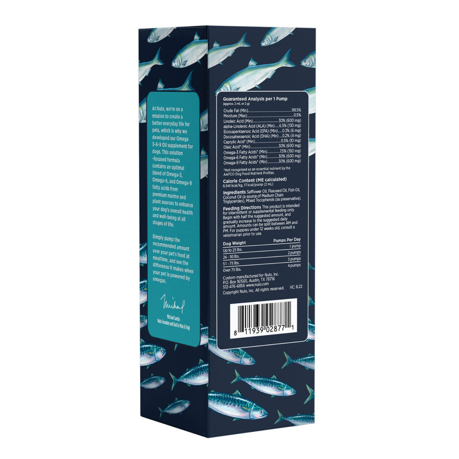 Nulo Omega 3-6-9 Oil for Dogs - PREMIUM SUPPLEMENT FOR PUPPIES & ADULTS Features a superblend of Safflower Oil; Flaxseed Oil; Marine Fish Oil (a blend of sardine; herring; mackerel and anchovy); and Coconut Oil. Complimentary omega 3-6-9 fatty acids work synergistically to support your dog’s skin; coat; joints; eyes; heart; and brain health. Benefits can include healthier skin; a lustrous coat; mental sharpness; and increased energy to enjoy more healthy days. Simply pump over your dog’s favorite food for an omega-boost at mealtime. Backed by both time-honored and emerging research in animal health and made by a NASC-preferred supplier for the highest quality standards. Contains no corn; soy; wheat; GMOs; or artificial preservatives. upgrade your pet’s omegas. cold-pressed & naturally preserved.
