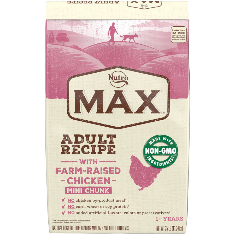 Nutro Max Mini Chunk Adult Recipe Dry Dog Food offers a great-tasting recipe will a smaller kibble that uses only natural ingredients, such as farm-raised chicken and whole grains. Nutro MAX never uses artificial colors, flavors or preservatives, chicken by-product meal, corn, wheat or soy protein. And because they are committed to giving your dog the highest-quality, safest food available, every recipe is made right here in their own U.S. facilities.