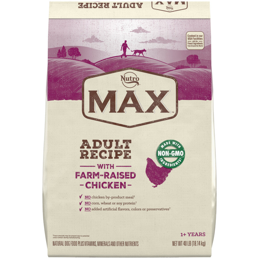 Nutro Max Adult Recipe Dry Dog Food offers a great-tasting recipe will a smaller kibble that uses only natural ingredients, such as farm-raised chicken and whole grains. Nutro MAX never uses artificial colors, flavors or preservatives, chicken by-product meal, corn, wheat or soy protein. And because they are committed to giving your dog the highest-quality, safest food available, every recipe is made right here in their own U.S. facilities.