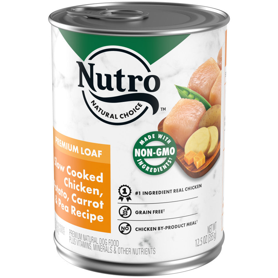 - Contains twelve (12) 12.5 oz. cans of NUTRO PREMIUM LOAF Slow Cooked Chicken, Potato, Carrot & Pea Recipe Adult Canned Wet Dog Food