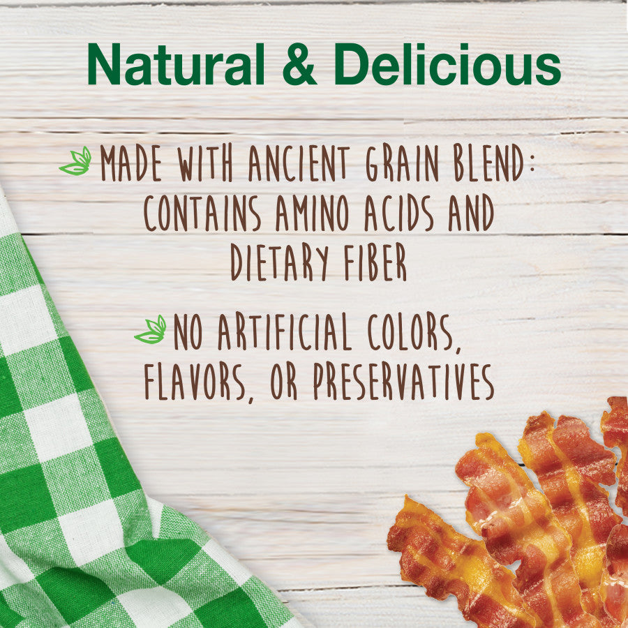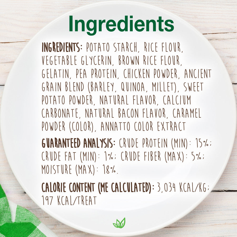 - Ingredients: Potato Starch, Rice Flour, Vegetable Glycerin, Brown Rice Flour, Geletin, Pea Protein, Chicken Poweder, Ancient Grain Blend (Barley, Quinoa, Millet), Sweet Potato Powder, Natural Flavor, Calcium Carbonate, Natural Bacon Flavor, Caramel Powder (Color), Annatto Color Extract