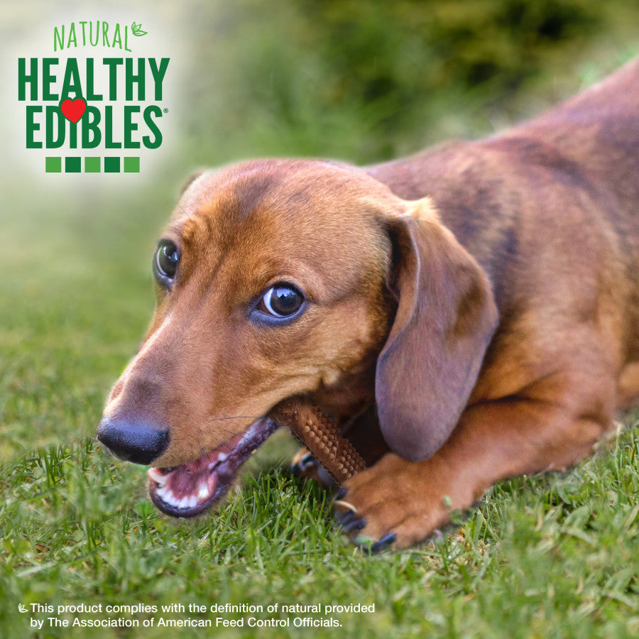 Our meatiest creation yet, Healthy Edibles Meaty Center treats are the ultimate savory indulgence, featuring a crave-worthy meaty center packed with irresistible flavor! These dog treats are as healthy as they are delicious, containing limited ingredients and no artificial colors, flavors, or preservatives. Plus, each dog treat is highly digestible and features dental nubs that help clean teeth through chewing action. Proudly made in the USA, Nylabone's long-lasting dog chew treats are great for rewarding and occupying your meat-loving furry friend!